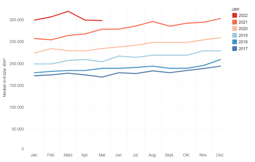 Der Markt mit den höchsten Kauffallzahlen in Niedersachsen ist der der Ein- und Zweifamilienhäuser. Entsprechend sind die Preistrends dazu in der Regel die robustesten. Hier wurde über alle Verkäufe in Niedersachsen betrachtet im März 2022 ein Medianwert von 320.000 Euro registriert. In den beiden Monaten danach ging der Wert auf 300.000 Euro zurück, was in etwa dem Niveau rund um den Jahreswechsel entspricht. Der Wert vom Mai 2022 liegt dabei um 7 % über dem des Vorjahresmonats. Zuvor waren die jährlichen Steigerungsraten meist im zweistelligen Prozentbereich.