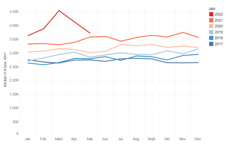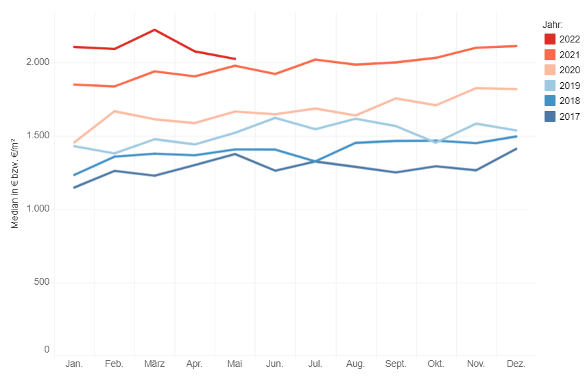 Bei den Eigentumswohnungen im Erstbezug ist auffällig, dass der Höchststand des Wohnflächenpreises im März 2022 sehr signifikant war. Der landesweite Median lag bei 4.500 Euro pro Quadratmeter Wohnfläche. Anschließend ging dieser Wert ähnlich zur Beobachtung bei den Ein- und Zweifamilienhäusern auf das Niveau vom Jahresanfang zurück. Im Mai betrug er rund 3.800 Euro pro Quadratmeter Wohnfläche. Der Abstand zum Vorjahresmonat in Höhe von 4 % ist so gering wie seit Dezember 2020 nicht mehr.