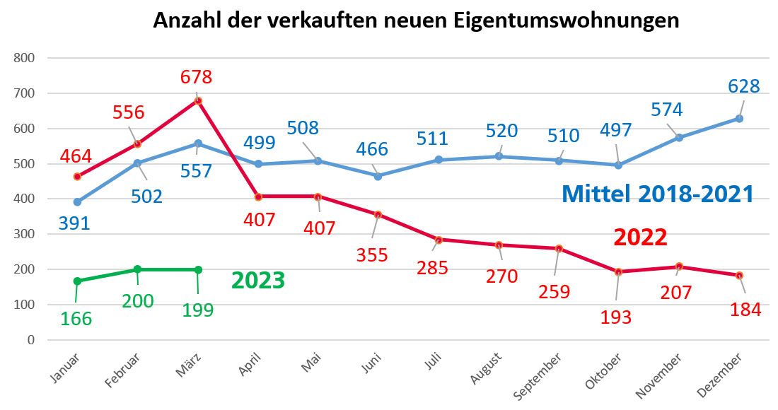 Auffällig ist, dass etwa mit Beginn des Ukraine-Kriegs und der seinerzeit absehbaren sich verstärkenden Zinsentwicklung und Inflation die Transaktionen noch ein auffälliges Maximum erreichten. Hier wurden vielfach Objekte mit Fertigstellungszeitpunkten in der Zukunft – teilweise 2024 – zu den „alten Bedingungen“ am Zinsmarkt veräußert.