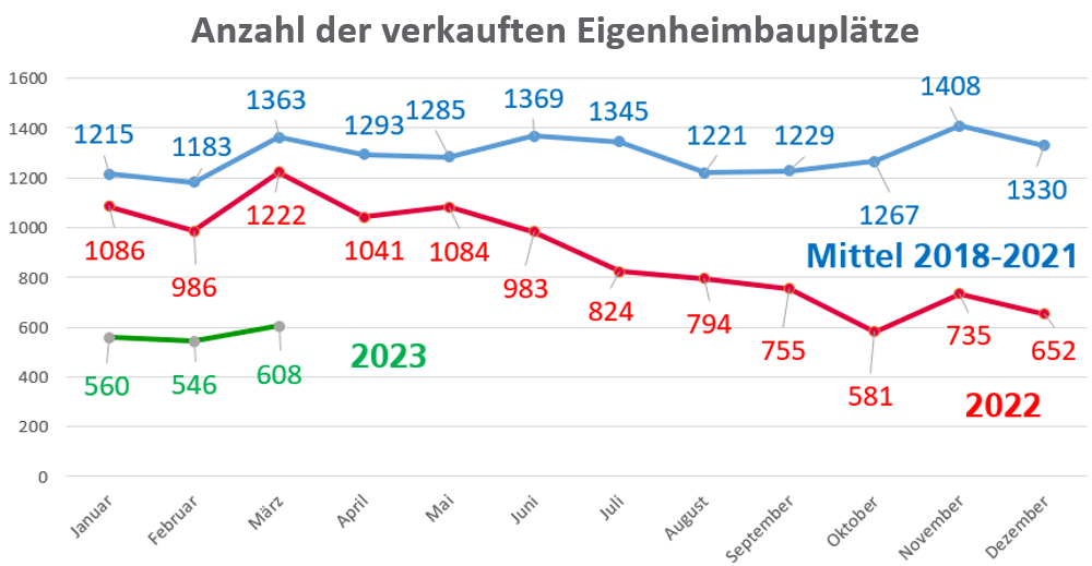Fast identisch ist die Entwicklung bei den verkauften Eigenheimbauplätzen (Abbildung 2). Auch hier liegt die Zahl der monatlichen Transaktionen nur noch bei einem Wert zwischen 40 und 50 Prozent des Mittelwerts aus den Jahren 2018 bis 2021. Auch bei den Bauplätzen für den Geschosswohnungsbau ist zurzeit keine Trendwende beim Tiefstand der Transaktionszahlen absehbar.