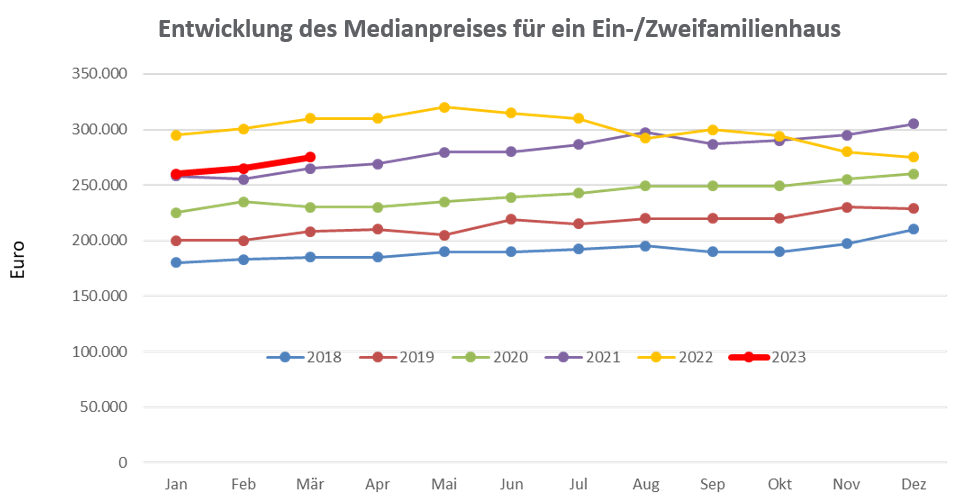 Die Lage auf dem Immobilienmarkt wird dominiert von einem derzeitigen Rückgang bei den Transaktionszahlen. Bei dem in Niedersachsen bedeutendsten Markt der Eigenheime bewegen sich die Kauffallzahlen seit Juni 2022 unter den jeweiligen Monatswerten der gemittelten vier Vorjahre. Bei den Ein- und Zweifamilienhäusern wurden in den zehn Monaten, die seit Juni 2022 bereits ausgewertet werden konnten, im Durchschnitt rund 20 Prozent weniger Objekte verkauft als im jeweiligen Vorjahresmonat.