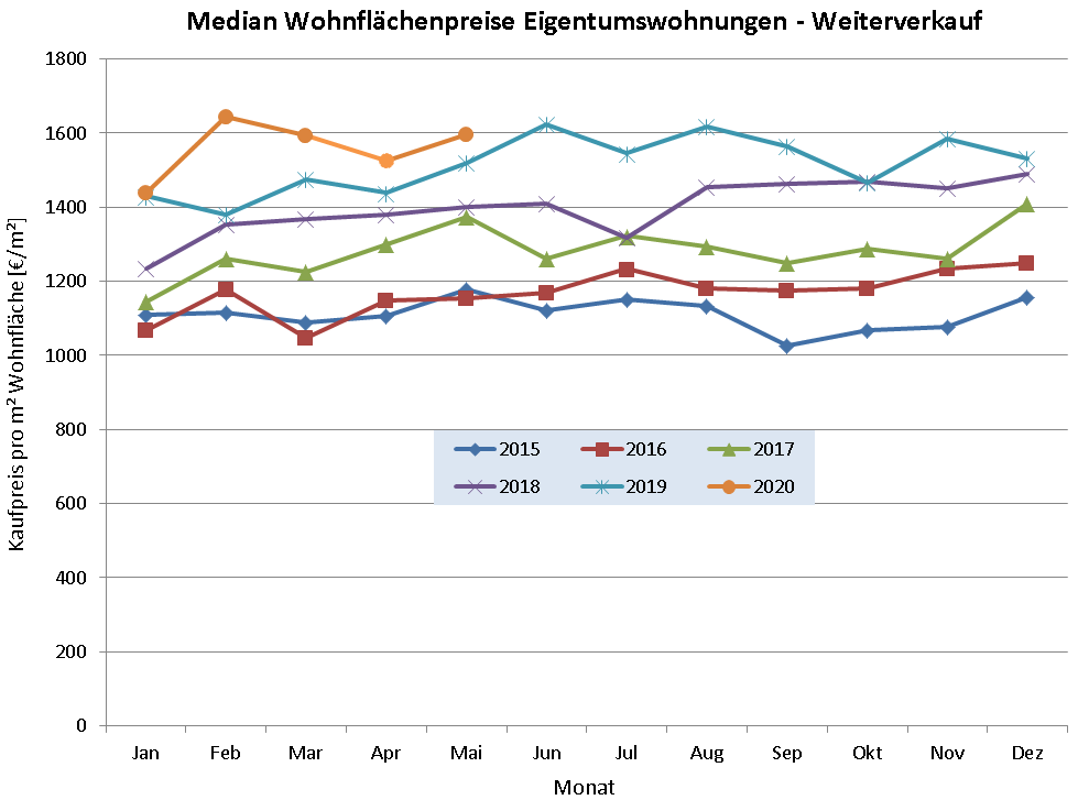 Bei Eigentumswohnungen wird als Bezugsgröße der auf die Wohnfläche umgerechnete Kaufpreis verwendet. Dieser liegt bei erstmalig bezogenen Objekten im Jahr 2020 im Schnitt bei über 3.000 Euro pro Quadratmeter Wohnfläche und fast 200 Euro über den Vorjahreswerten. Im Mai 2020 ist der Wert auf 3.000 Euro pro Quadratmeter gesunken. Eine ähnliche Tendenz gab es bereits im Vorjahr, so dass dieser Einfluss kaum der Corona-Krise zuzuschreiben ist (Abbildung 3). Auch bei Weiterverkäufen von Eigentumswohnungen liegen die Wohnflächenpreise über denen des Vorjahres – in den letzten Monaten um rund 100 Euro pro Quadratmeter. Während der Median im Februar 2020 auf einen Höchstwert von über 1.600 Euro pro Quadratmeter Wohnfläche stieg, gab es danach eine kleine Delle, die jedoch schon im Mai überwunden war (Abbildung 4).