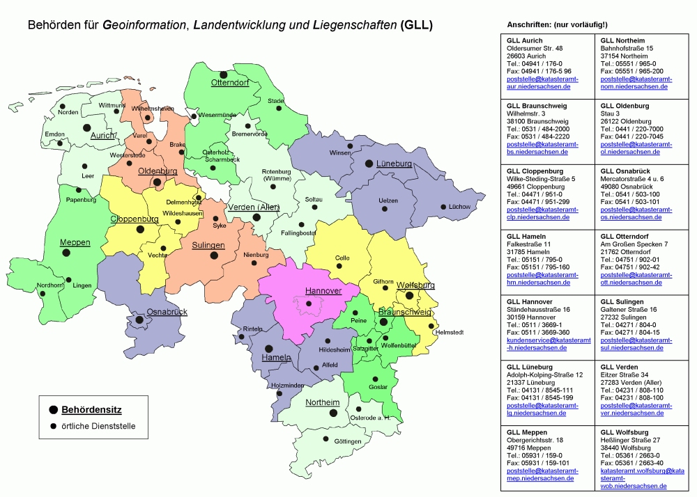 Durch die Änderung der Verordnung zur Durchführung des Baugesetzbuches vom 1.12.2004 werden mit Wirkung vom 1.1.2005 die örtlichen Gutachterausschüsse jeweils für den Bereich einer Vermessungs- und Katasterbehörde eingerichtet. Weiter werden die Vermessungs- und Katasterbehörden durch Beschluss der Landesregierung vom 13.7.2004 (Nds. MBl. S. 688) in die neue Behörde für Geoinformation, Landentwicklung und Liegenschaften (GLL) integriert. Die Gutachterausschüsse führen die Bezeichnung "Gutachterausschuss für Grundstückswerte NN", wobei für NN der Name des Behördensitzes einzutragen ist. Die Amtsbezirke können Sie der Anlage entnehmen.